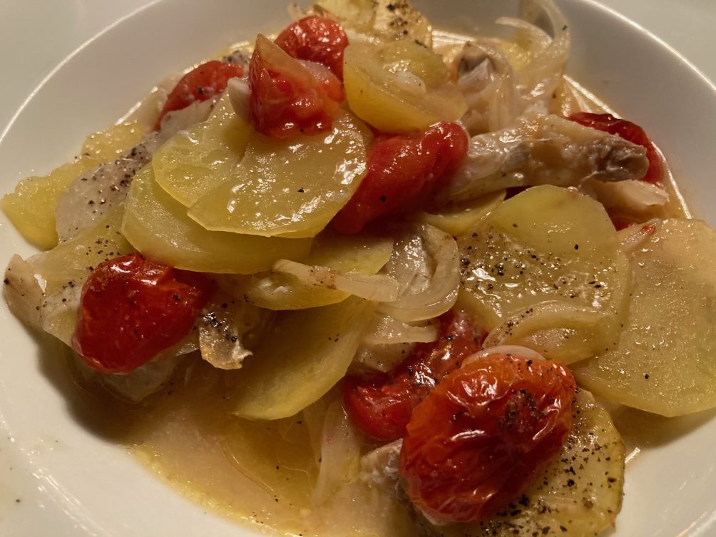 - zweite Hälfte Kartoffeln auf dem Fisch verteilen