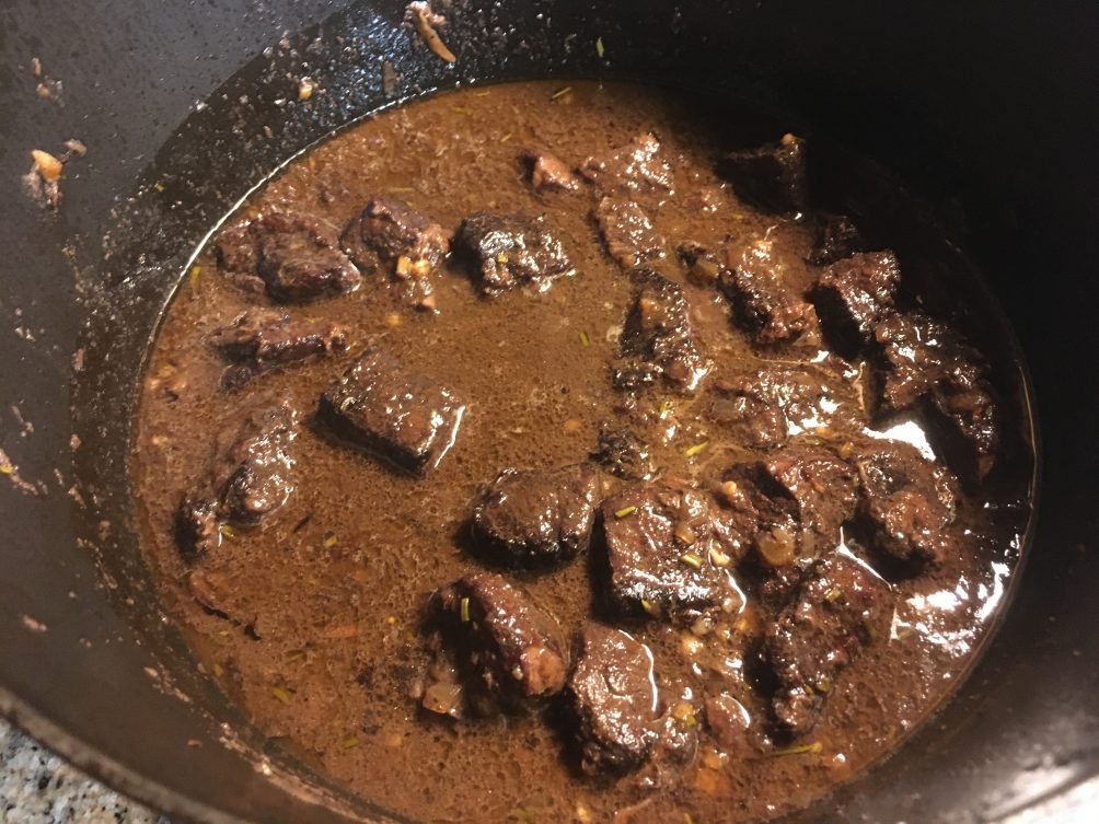 - mit der Hälfte der Marinade ablöschen, ca 1.5h schmoren