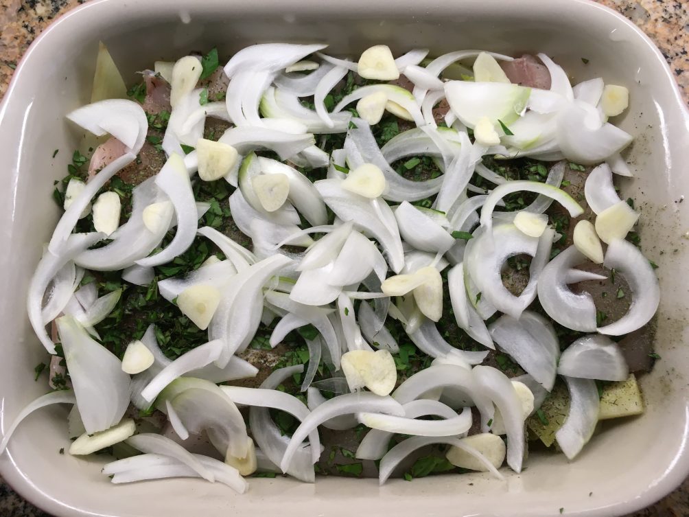 - Peterlig und Basilikum fein schneiden über dem Fisch verteilen