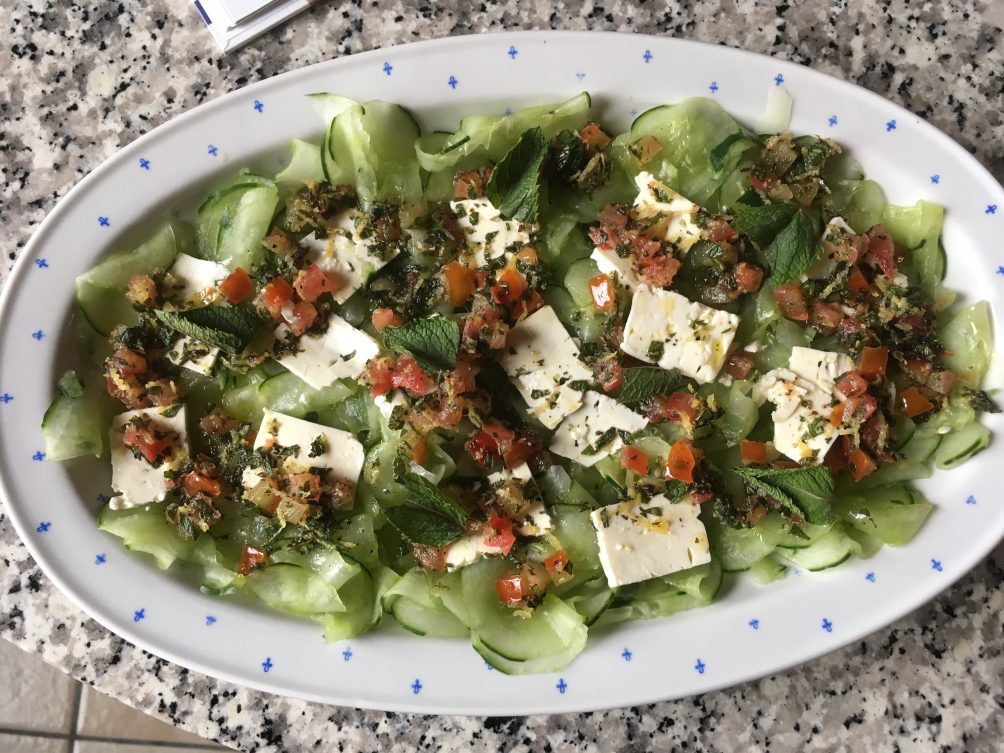 - Feta in feine Scheiben schneiden und auf den Gurken verteilen